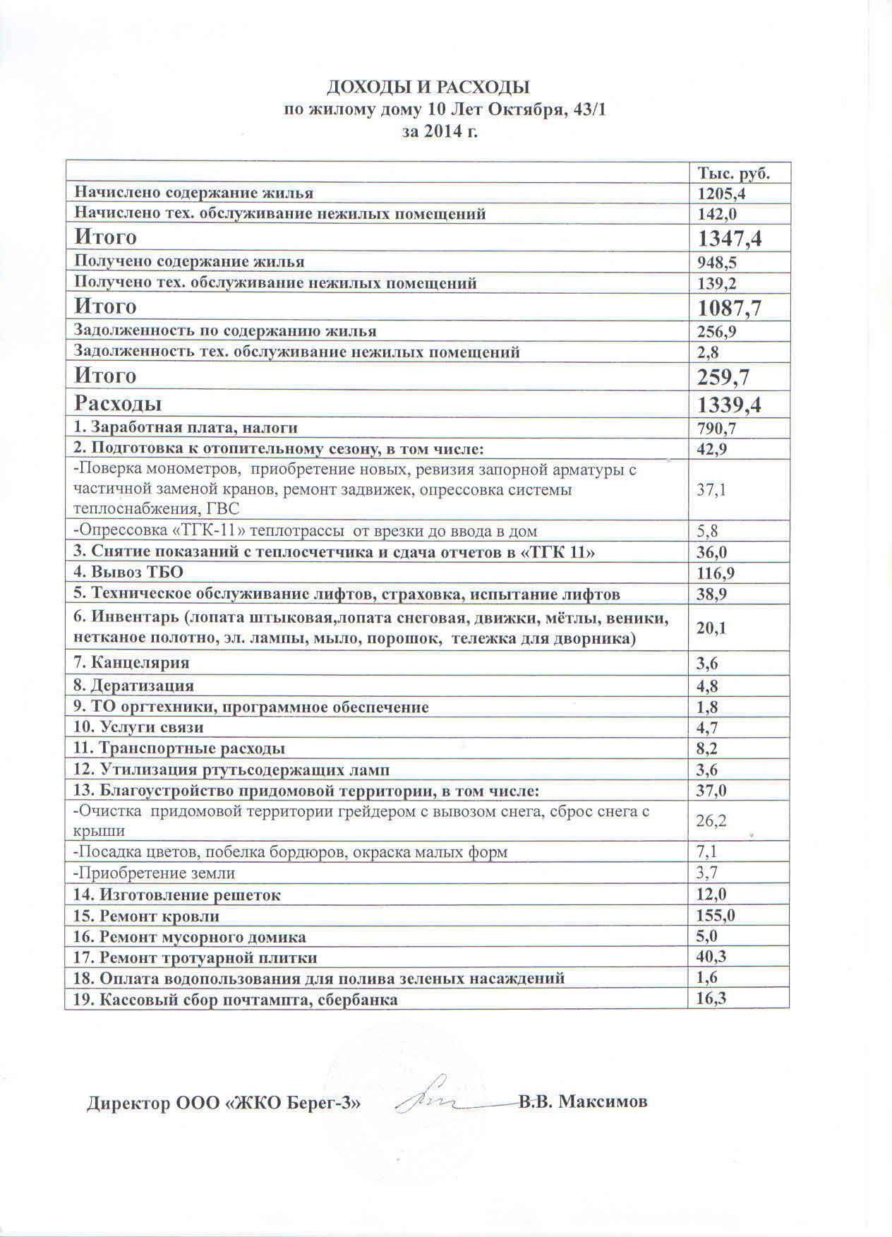 Доходы и расходы ООО "ЖКО "Берег-3" за 2014 год: