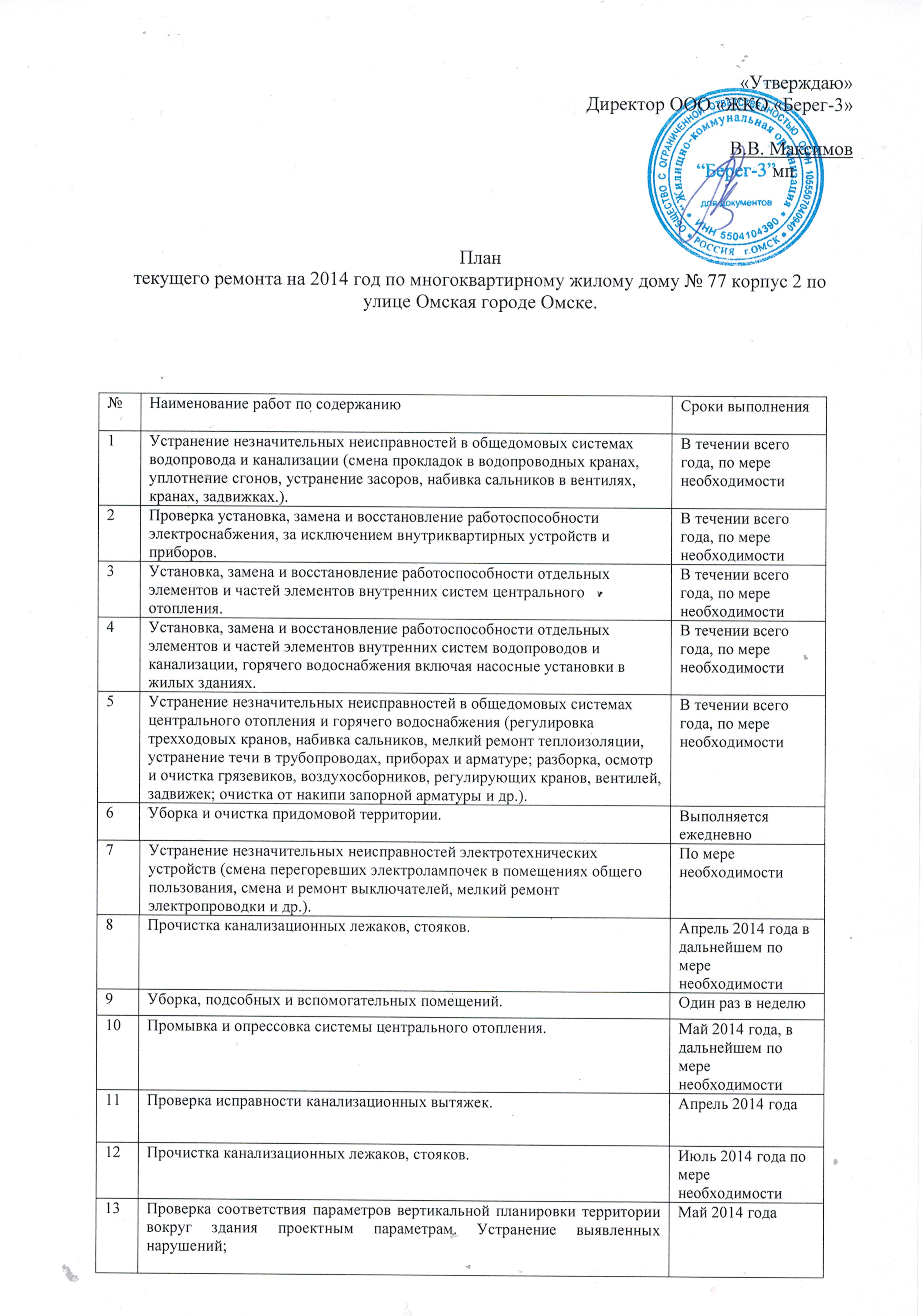 План работы по текущему ремонту многоквартирных домов (2014 г.):